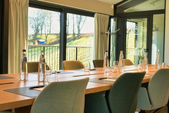 Notre salle de réunion, située au-dessus du domaine viticole, offre une atmosphère unique alliant élégance contemporaine et connexion avec la nature.